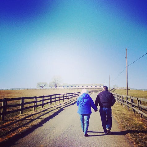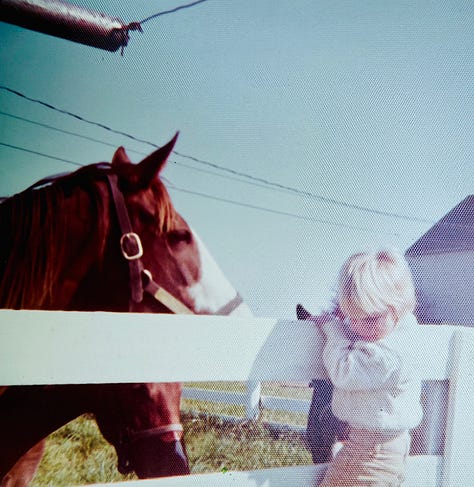 In 1974, he came across a help-wanted ad for a stablehand and broodmare manager on a thoroughbred horse farm in Versailles, KY. Some college was required, unusual for a farmhand, but he was qualified. The thought of working with horses was exciting. We flew out for an interview, and he was given the job. We both gave notice to our employers. He dropped out of college. We packed up a truck and the three of us (yes, we had a son) moved to Kentucky. It was a wild and impetuous decision. Mind you, we were 75 days shy of being 23 and 22. And he had never handled a horse!
